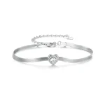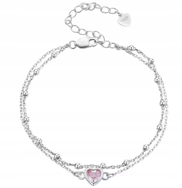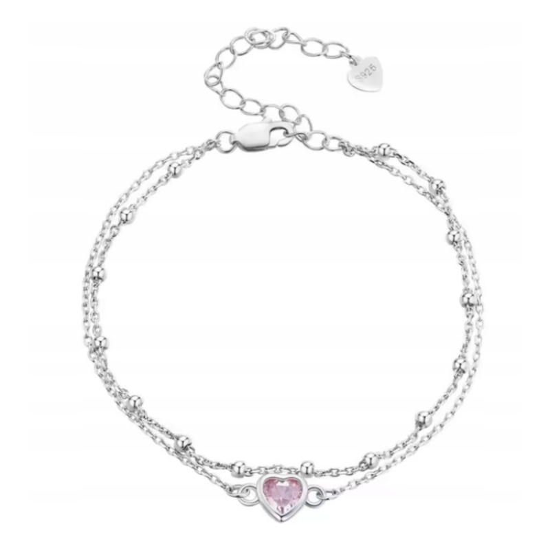 Elegantna srebrna narukvica sa nježnim rozim srcem koje simbolizira ljubav, nježnost i pažnju. Fini dvostruki lanac daje joj sofisticiran i lagan izgled, savršen za svakodnevno nošenje ili kao suptilan detalj uz posebne prilike. Podesiva dužina omogućava udobno pristajanje, dok sjaj srebra i romantična roza boja srca čine ovu narukvicu idealnim poklonom za voljenu osobu – ili za mali znak ljubavi prema sebi.