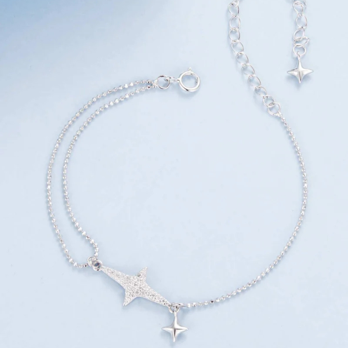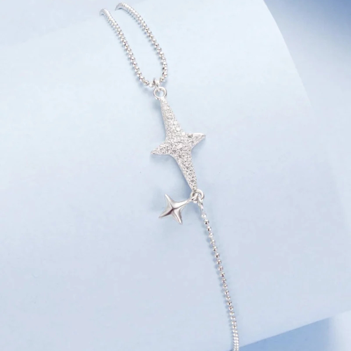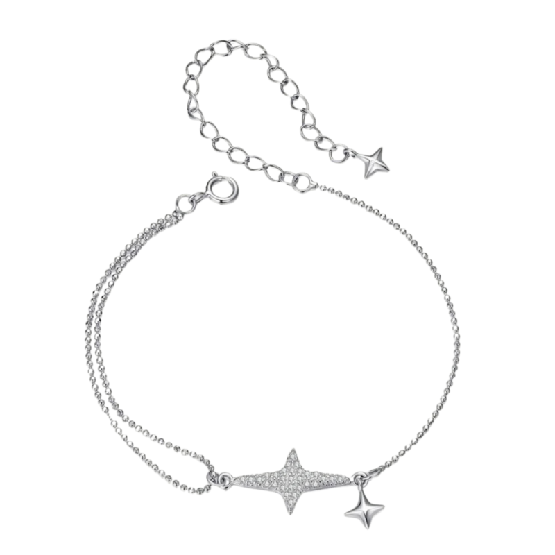 Zvjezdana harmonija utjelovljuje savršenu ravnotežu između sjaja i jednostavnosti. U njenom dizajnu ističe se jedna zvijezda optočena blistavim cirkonima, simbol svjetlosti i snova, dok je prate dvije zvijezde od čistog srebra koje donose osjećaj smirenosti i elegancije. Ovaj sklad različitih tekstura i sjaja stvara profinjen, bezvremenski izgled. Nježna i sofisticirana, narukvica je idealna za svakodnevno nošenje, ali i kao poseban detalj za večernje prilike – simbol unutarnje ravnoteže, ljepote i osobnog sjaja.