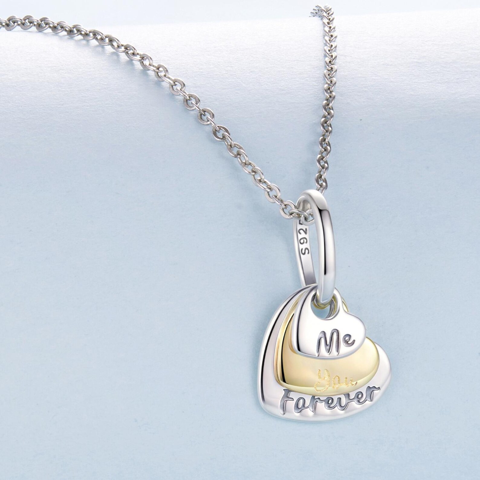 Postoji li bolji način za spojiti bezvremensku eleganciju srebra i suptilnu toplinu pozlate, od stvaranja ovakve sofisticirane harmonije ? Dizajn u obliku tri srca, koja se skladno preklapaju, predstavlja neraskidivu povezanost i dubinu emocija koje vežu dvoje ljudi. Svako srce nosi posebnu poruku: “Me”, “You” i “Forever”, simbolizirajući vječnu ljubav, odanosti i zajedništvo. Ovaj privjesak nije samo modni dodatak za Vašu narukvicu ili ogrlicu, već i emotivni talisman koji nosi priču o neprekidnoj ljubavi i trajnoj povezanosti.